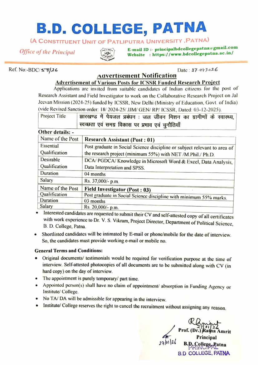 the cause of education. B.D. College, Patna, previously known as B.D. College, came into being in 1970