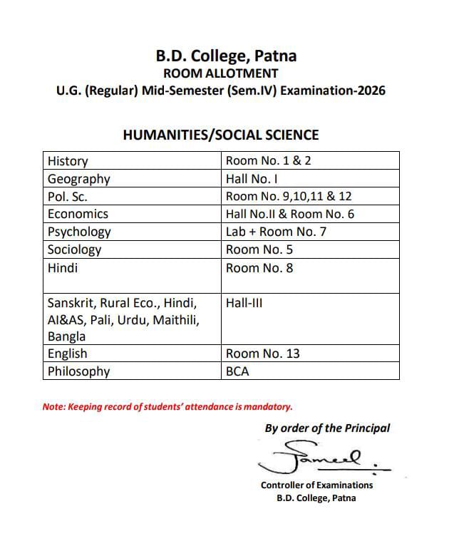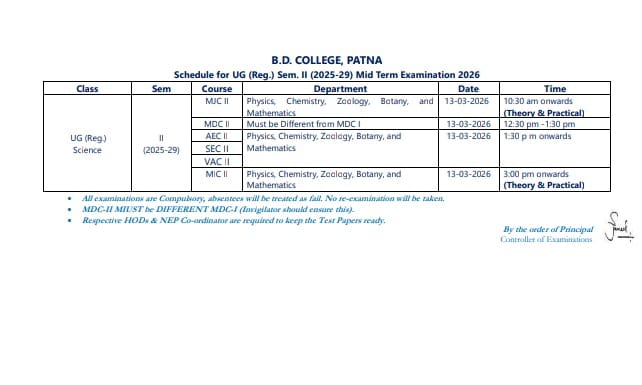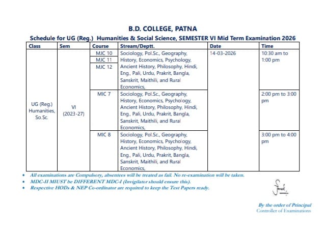 B.D. College, Patna announces the Mid Term Examination 2026 for UG Semester IV and VI (Humanities & Social Science). Exams are scheduled for March 13th & 14th. Attendance is compulsory; absentees will be marked as fail. No re-exams allowed.