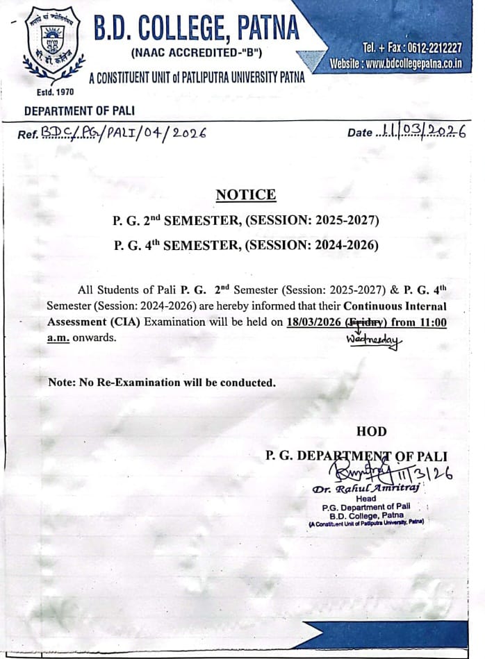 P.G. Pali students (Sessions 2025-27 & 2024-26) are notified that CIA exams will be held on 18/03/2026 (Wednesday) starting at 11:00 a.m. Please note that attendance is mandatory, as no re-examinations will be conducted under any circumstances.