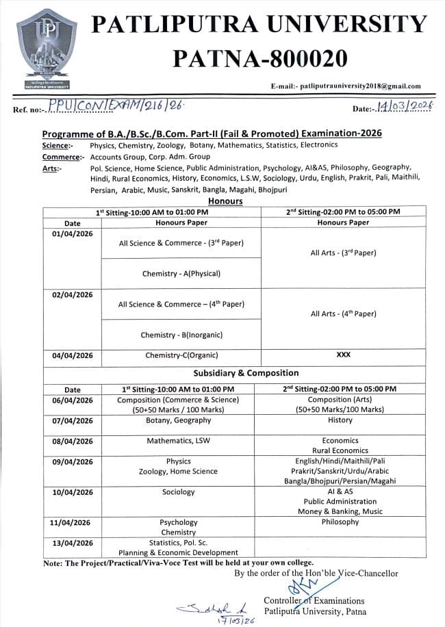 Update date:- 01-04-2026 :15:59:00Ref. No. 216 The university has released the schedule for B.A., B.Sc., and B.Com Part-II (Fail & Promoted) exams 2026. It details dates, sittings, and subjects for Honours, Subsidiary, and Composition papers, with practicals at respective colleges.