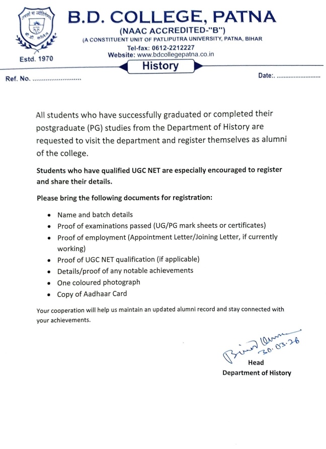 Update date:- 01-04-2026 :15:46:58B.D. College, Patna invites History graduates and postgraduates to register as alumni. UGC NET qualified students are especially encouraged to share details. Required documents as per Notice