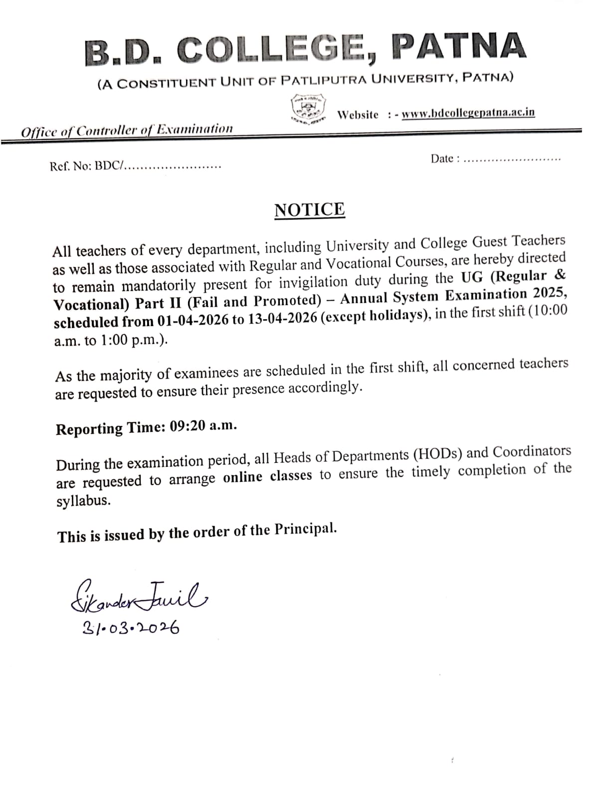Update date:- 01-04-2026 :16:40:00B.D. College, Patna directs all teachers, including guest faculty, to attend invigilation duty for UG Part II (Fail/Promoted) Annual Exams from 01–13 April 2026, first shift 10:00 a.m.–1:00 p.m. Reporting time is 09:20 a.m.