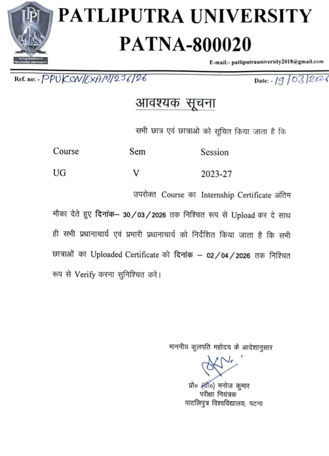 Update date:- 01-04-2026 :15:16:17Ref.No: 236/26 UG Semester V (Session 2023-27) students must upload their internship certificates by 30 March 2026. Principals and heads must verify all submissions by 2 April 2026, as directed by the Controller of Examinations.