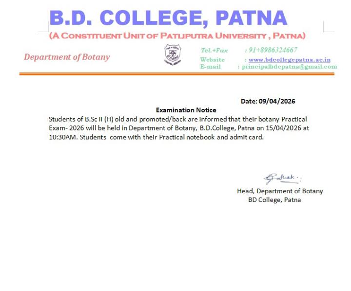Update date:- 01-04-2026 :15:29:54B.D. College, Patna announces Chemistry Practical Exam-2026 for B.Sc II students. Honors exam will be held on 13-04-2026 at 11:00am, and Subsidiary exam on the same day at 1:30p in the Dept. of Chemistry. Students are advised to attend as scheduled.