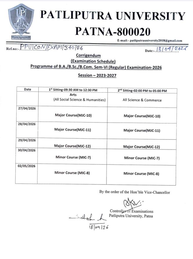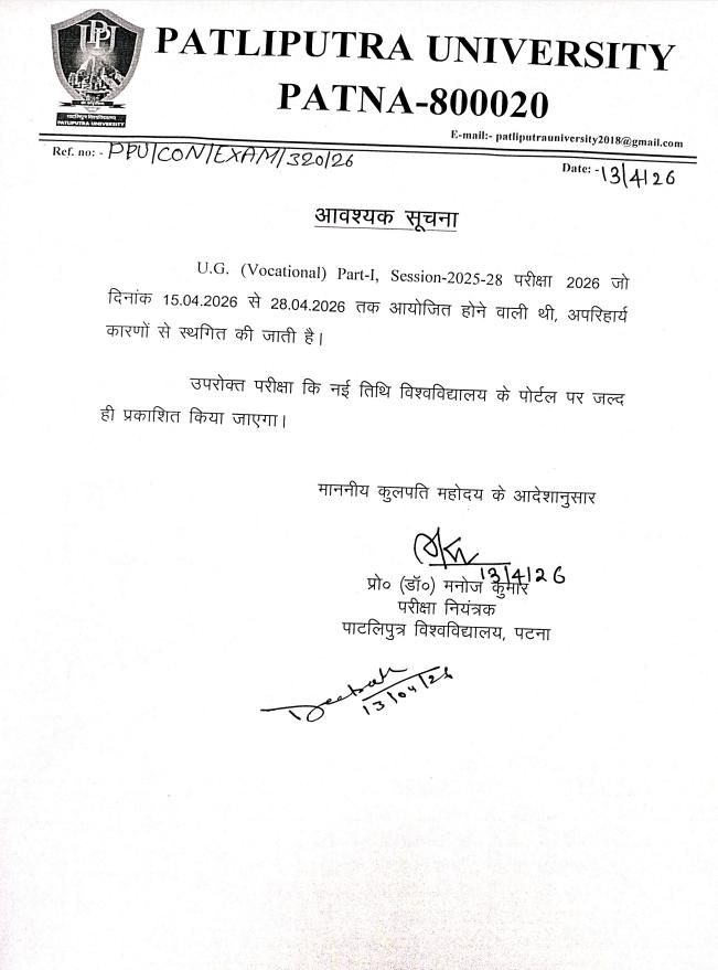 The U.G. (Vocational) Part-I exams scheduled from April 15 to April 28, 2026, are postponed due to unavoidable reasons. Revised dates for the Session 2025-28 exams will be published soon on the official Patliputra University portal.