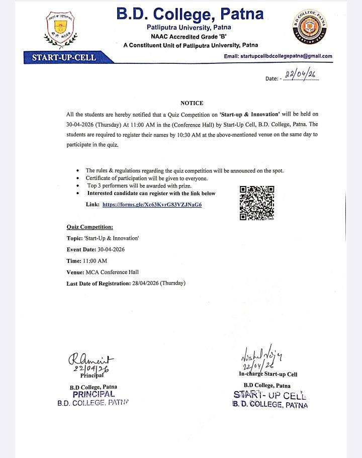 Update date:- 09-03-2026 :11:55:41The Start-up Cell of B.D. College, Patna, under the guidance of Principal Ratna Amrit, organized a speech competition in the MCA Conference Hall on the topic "Growth of Start-ups and MSMEs in Bihar."