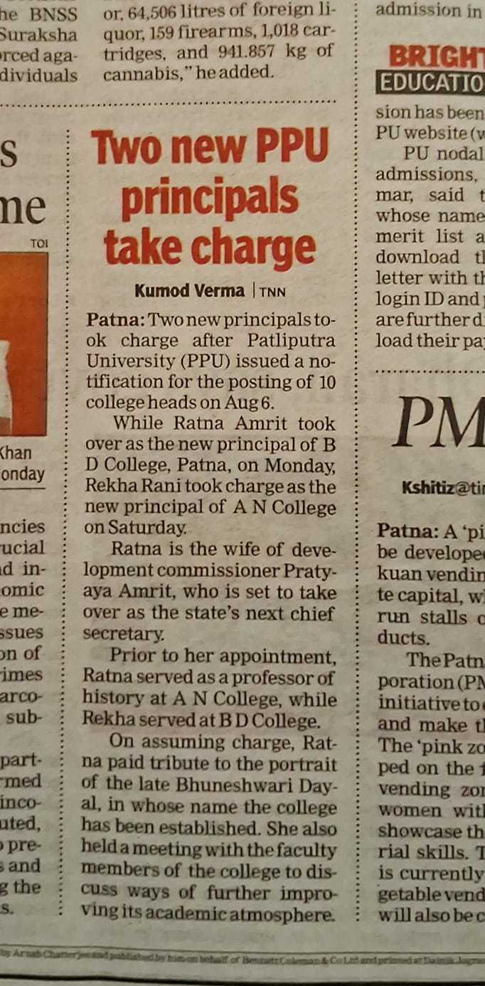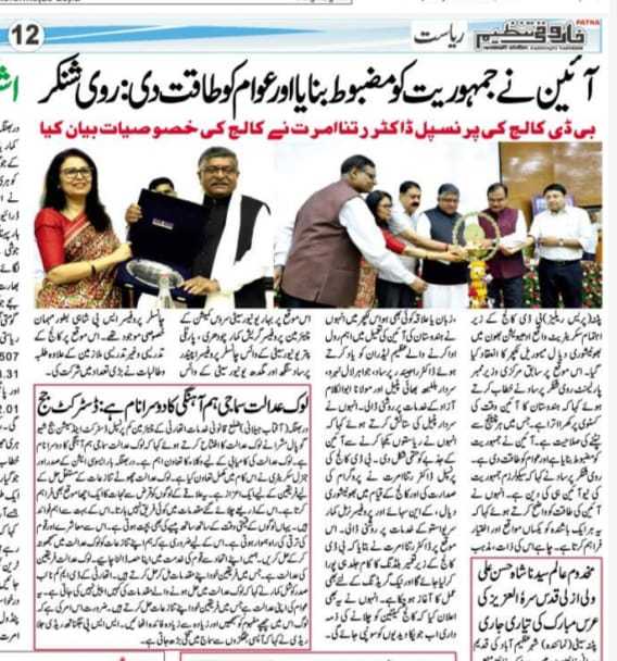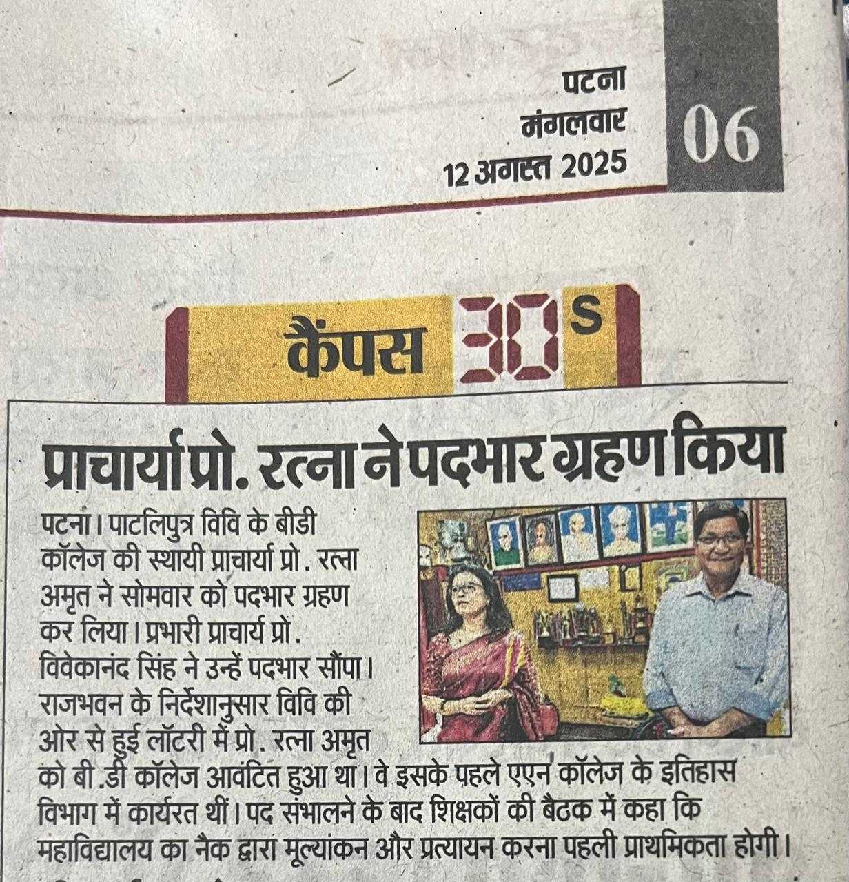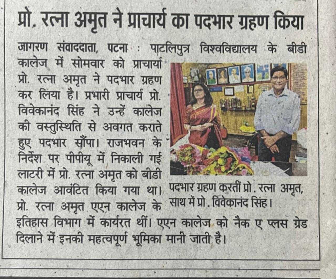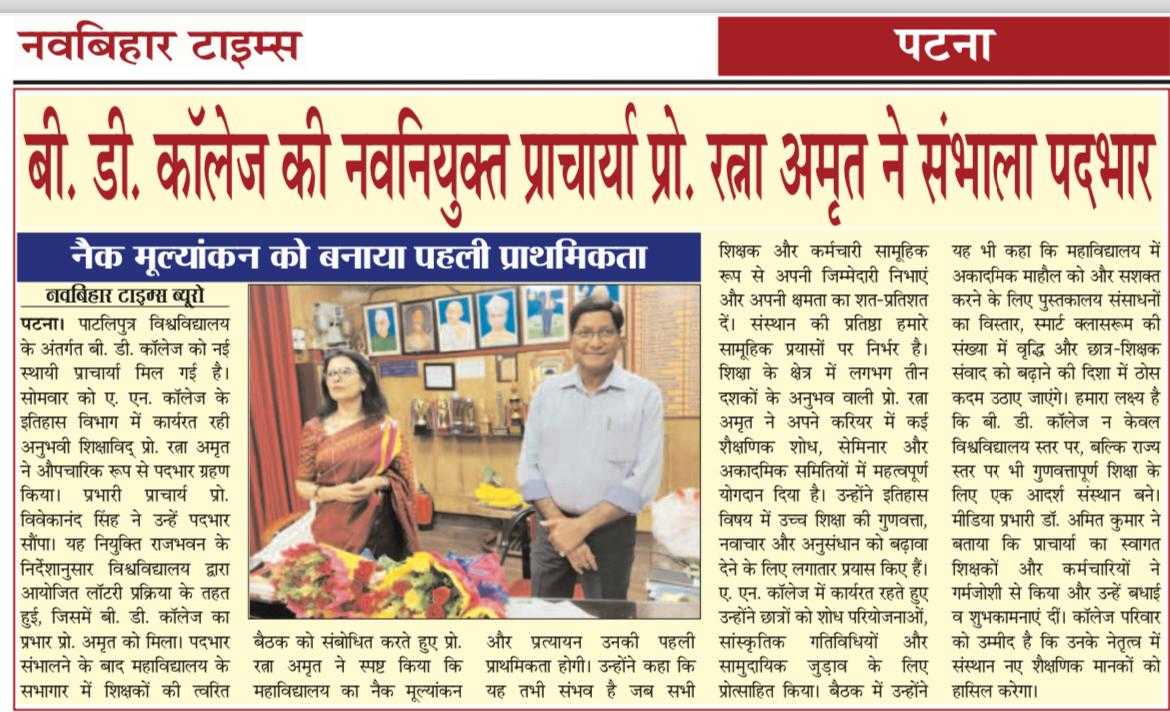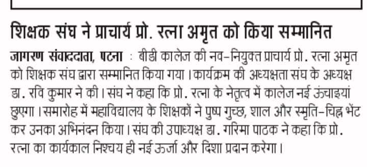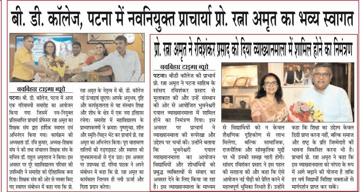 The newly appointed Principal of BD College, Professor Ratna Amrit, was felicitated by the Teachers' Association. President Dr. Ravi Kumar presided over the event.