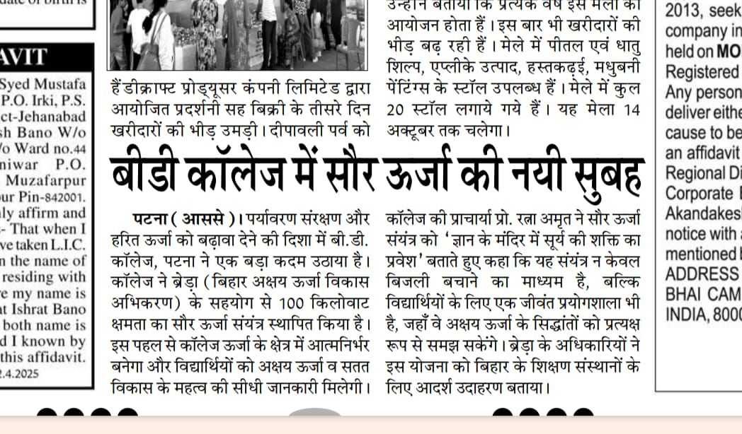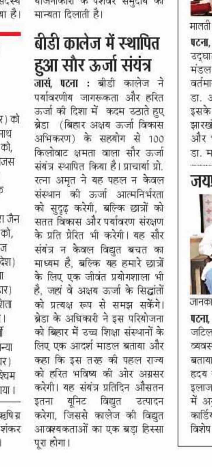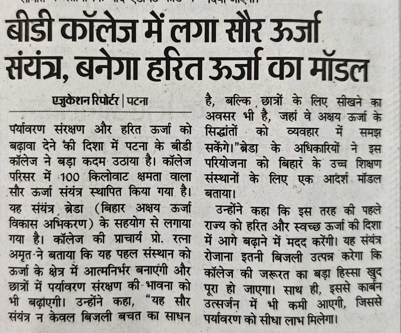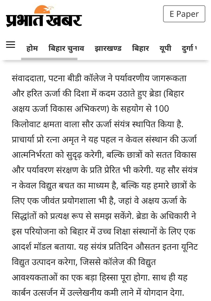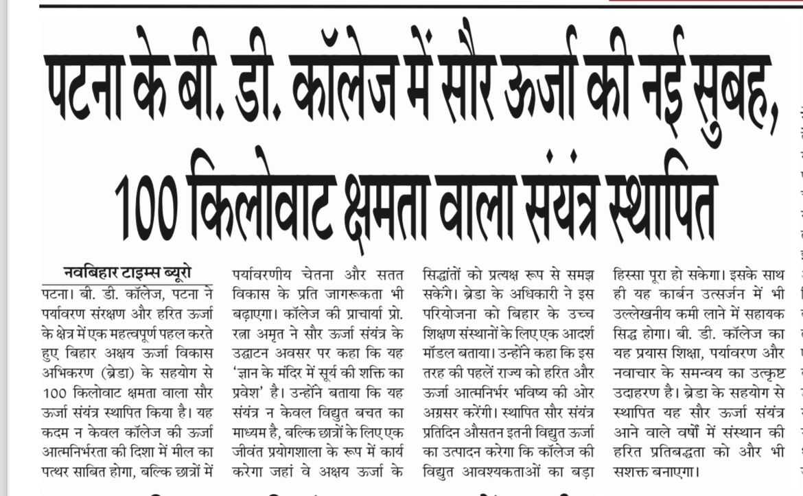 A new dawn of solar energy has arrived at Patna's B.D. College, with a 100 kW plant installed.