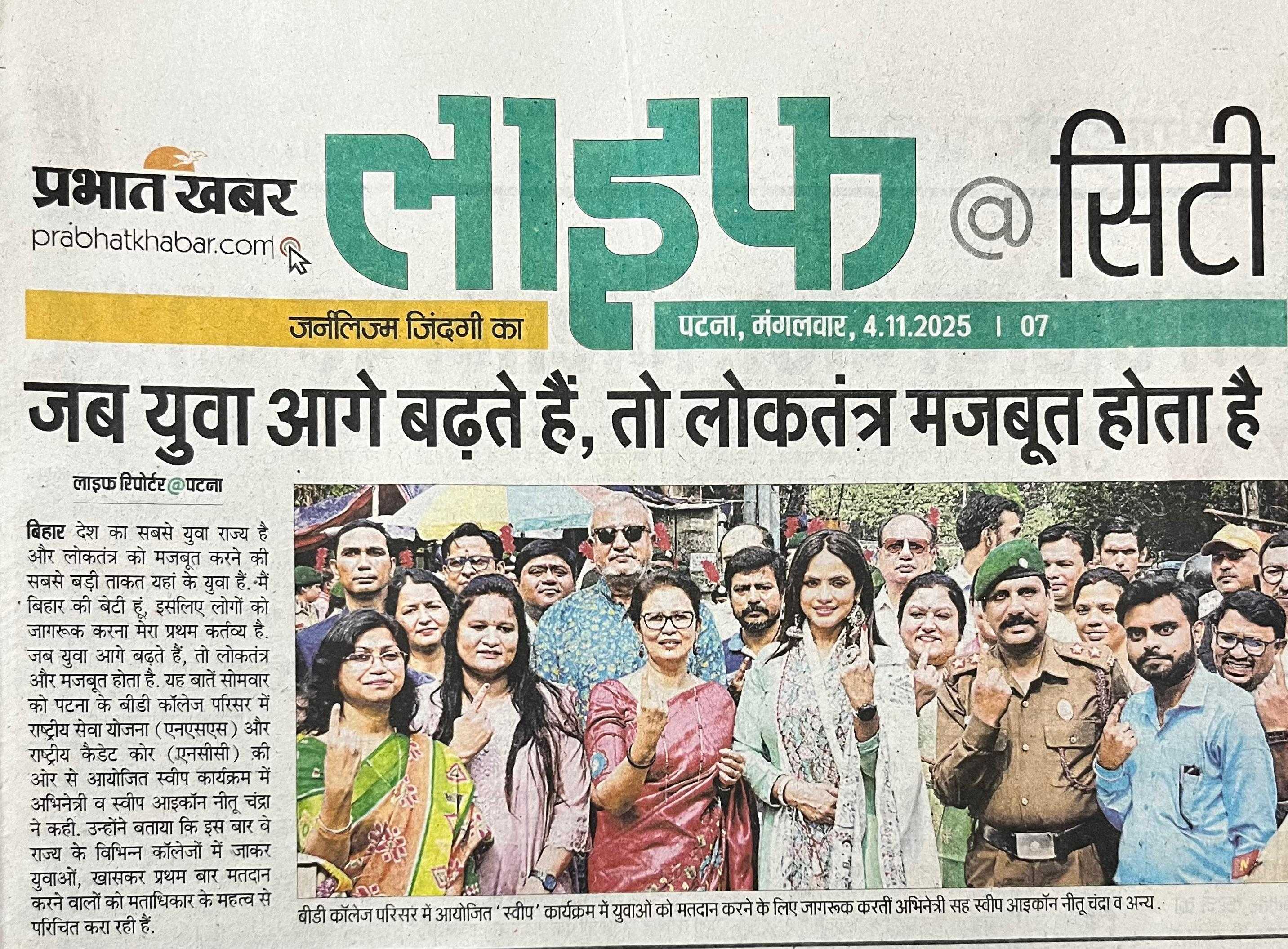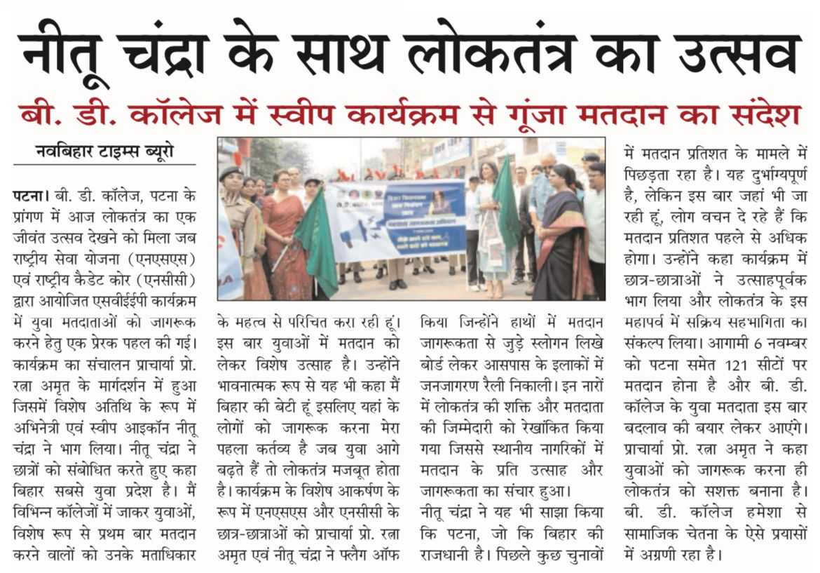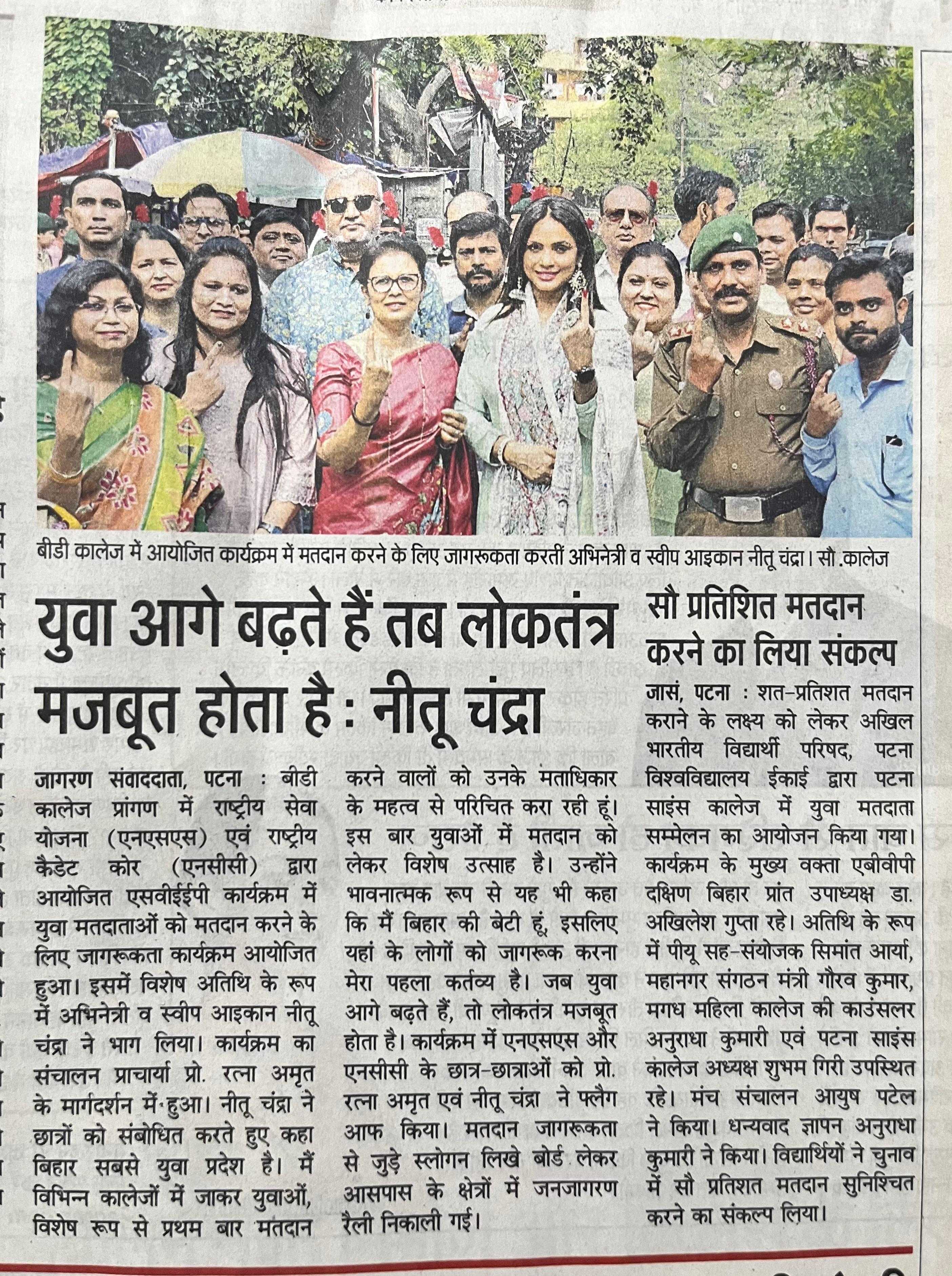 Celebrating Democracy with Neetu Chandra The message of voting resonated through the SVEEP program at B.D. College.