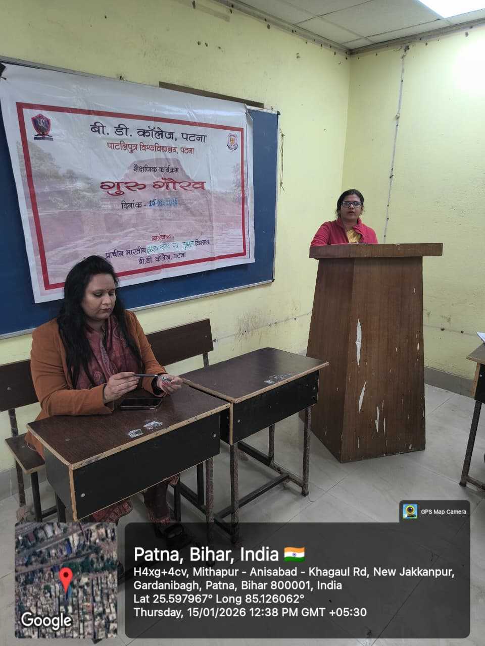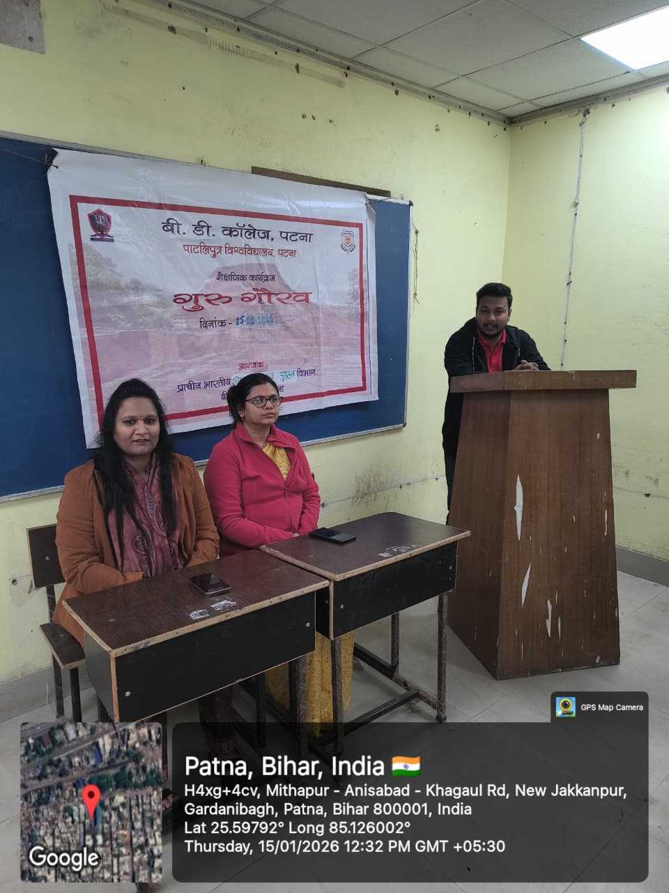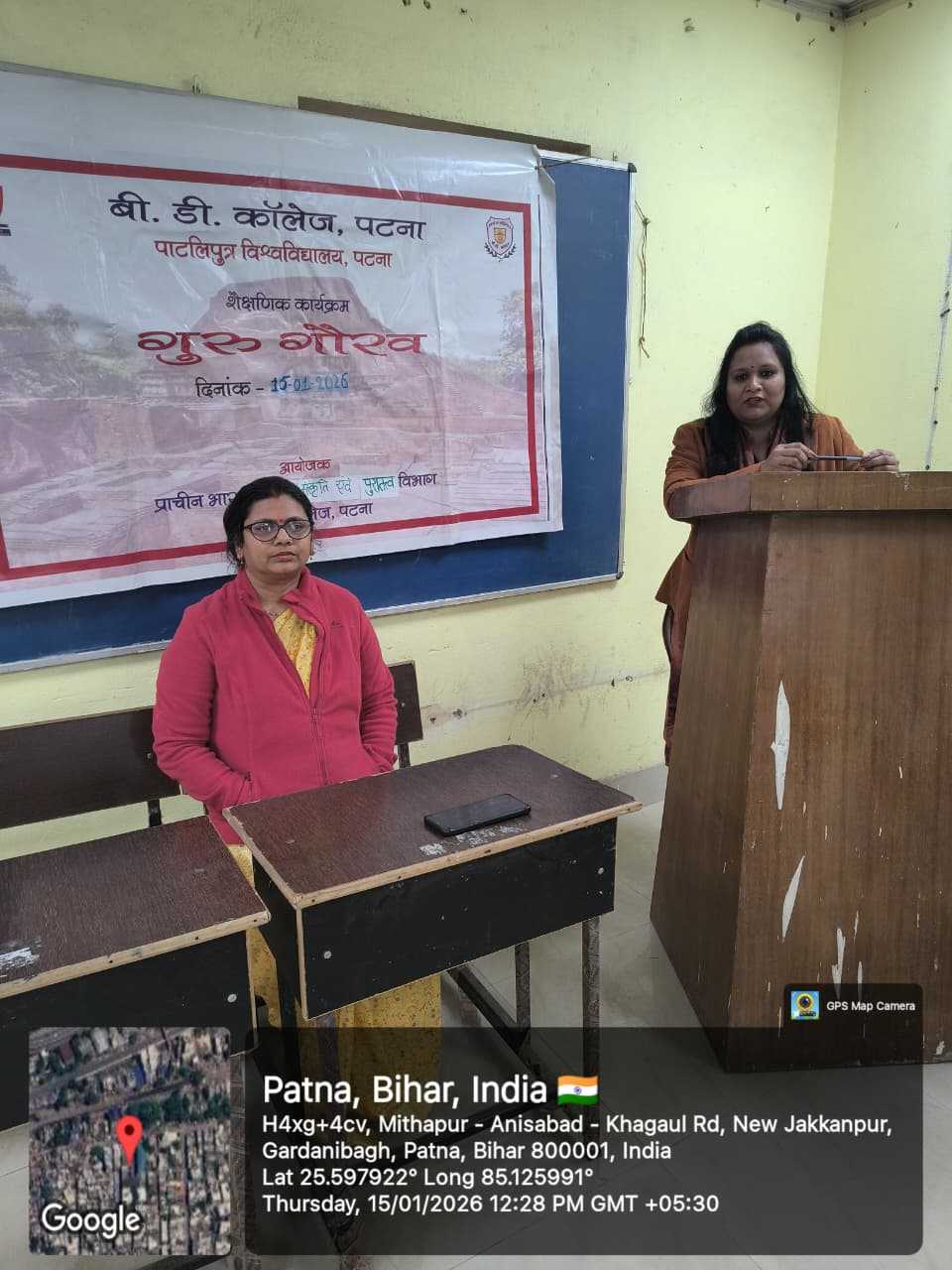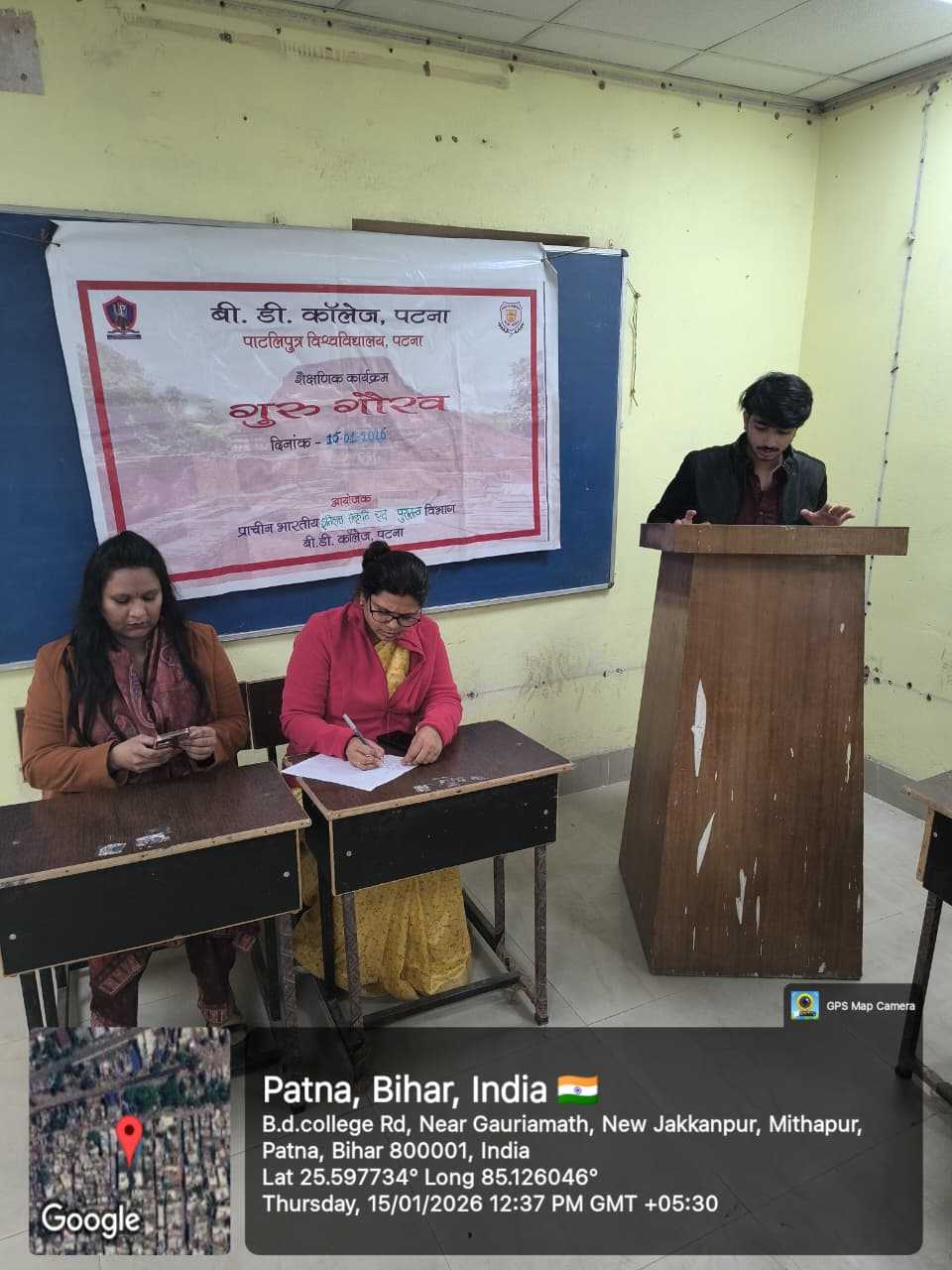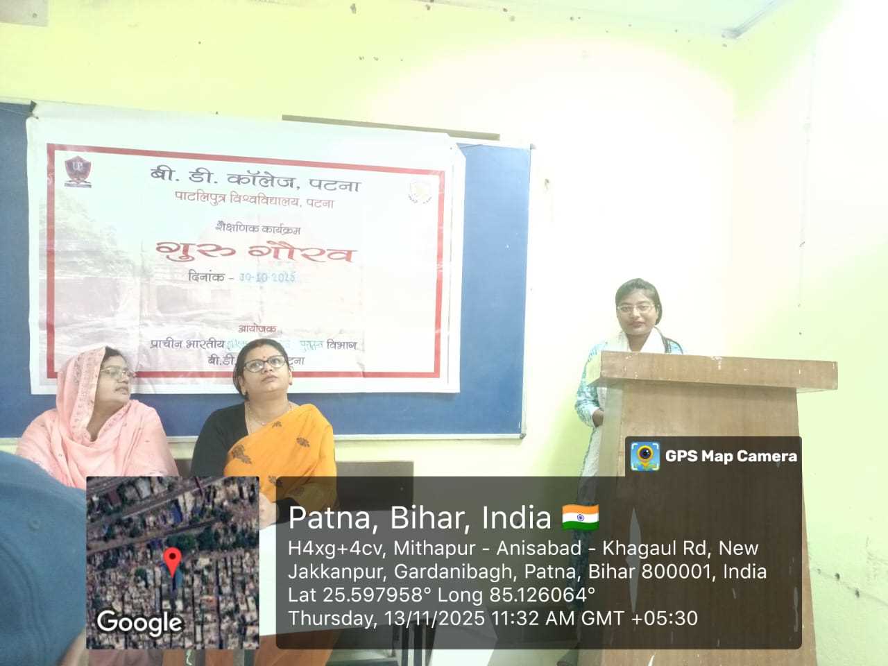The Department of Ancient History, Culture, and Archaeology at B.D. College, Patna, successfully organized an impromptu speech competition on "The Relevance of Marriage as an Ancient Indian Social Institution" on November 13, 2025, as part of the weekly academic series "Guru Gaurav." The program was inspired by the educational guidance and encouragement of the college's Principal, Professor Ratna Amrit. The program was conducted by the Head of the Department, Mrs. Neetu Tiwari.