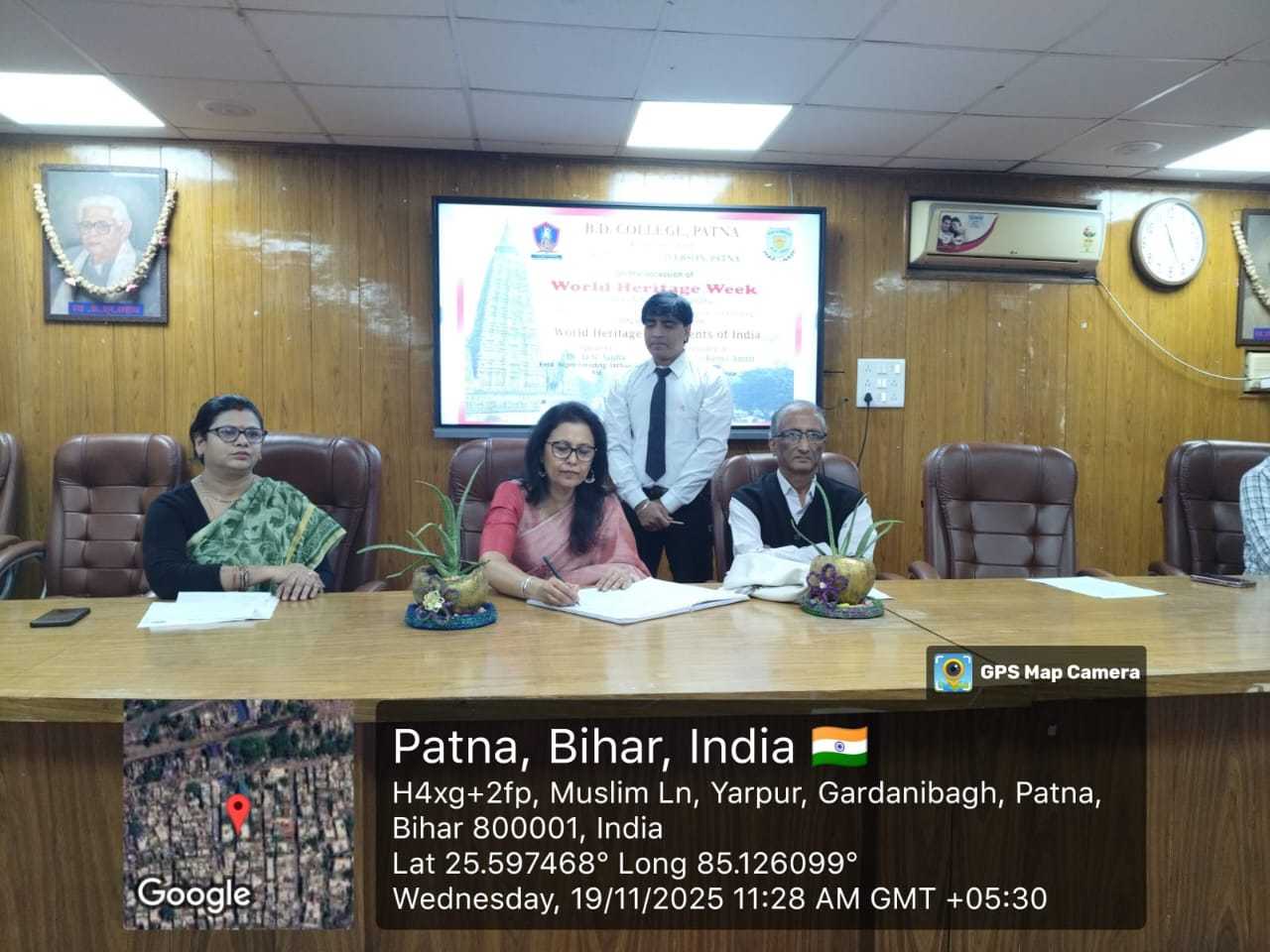 To commemorate World Heritage Week (November 19–25), the Dept of Ancient History, Culture, and Archaeology, BD College, Patna, organized an academic lecture program on 19-11-2025. The program began with the presidential address and a dignified welcome address by the Principal, Prof. Dr. Ratna Amrit. Dr. D.N. Sinha, former Superintending Archaeologist, Archaeological Survey of India (Patna Circle), was invited as the keynote speaker.