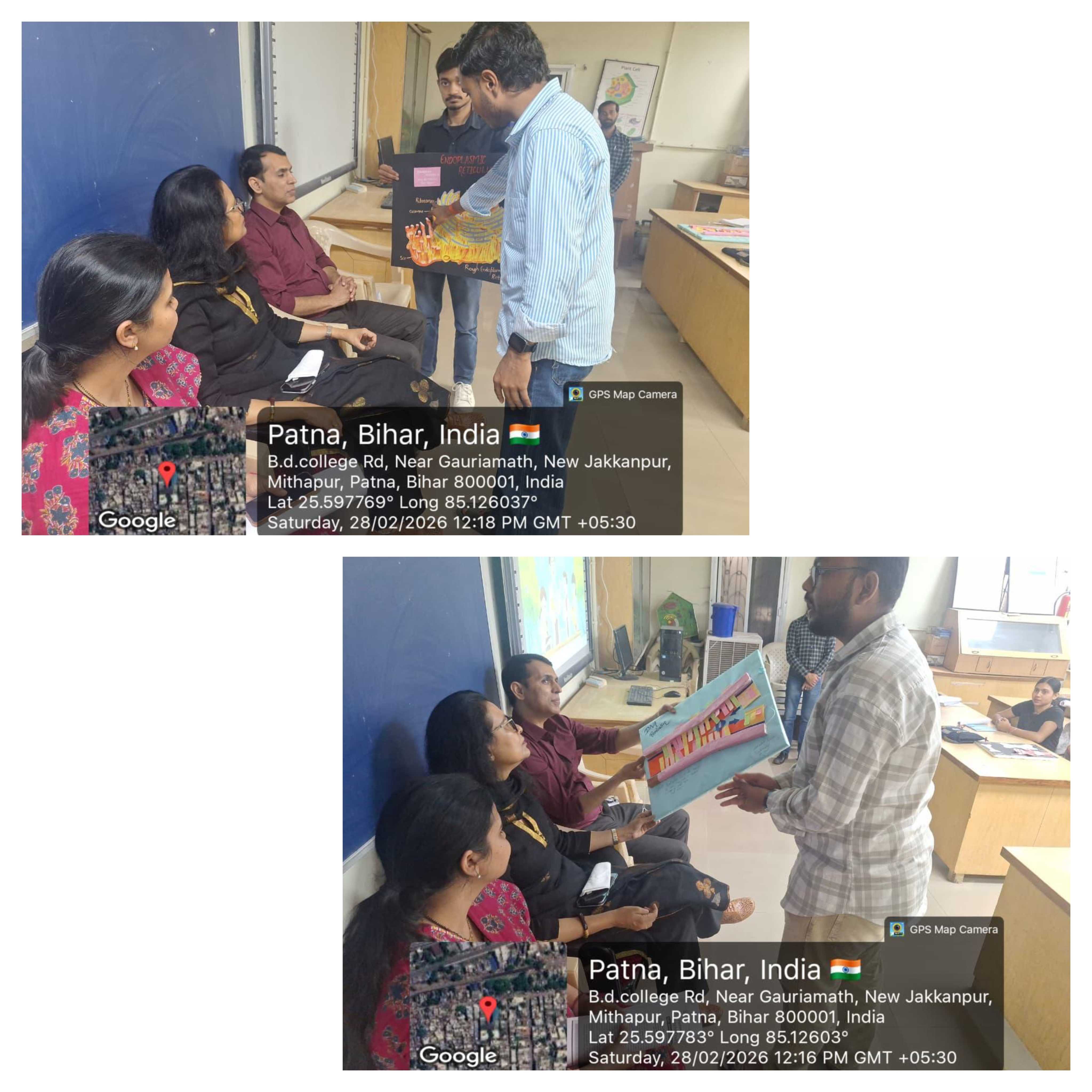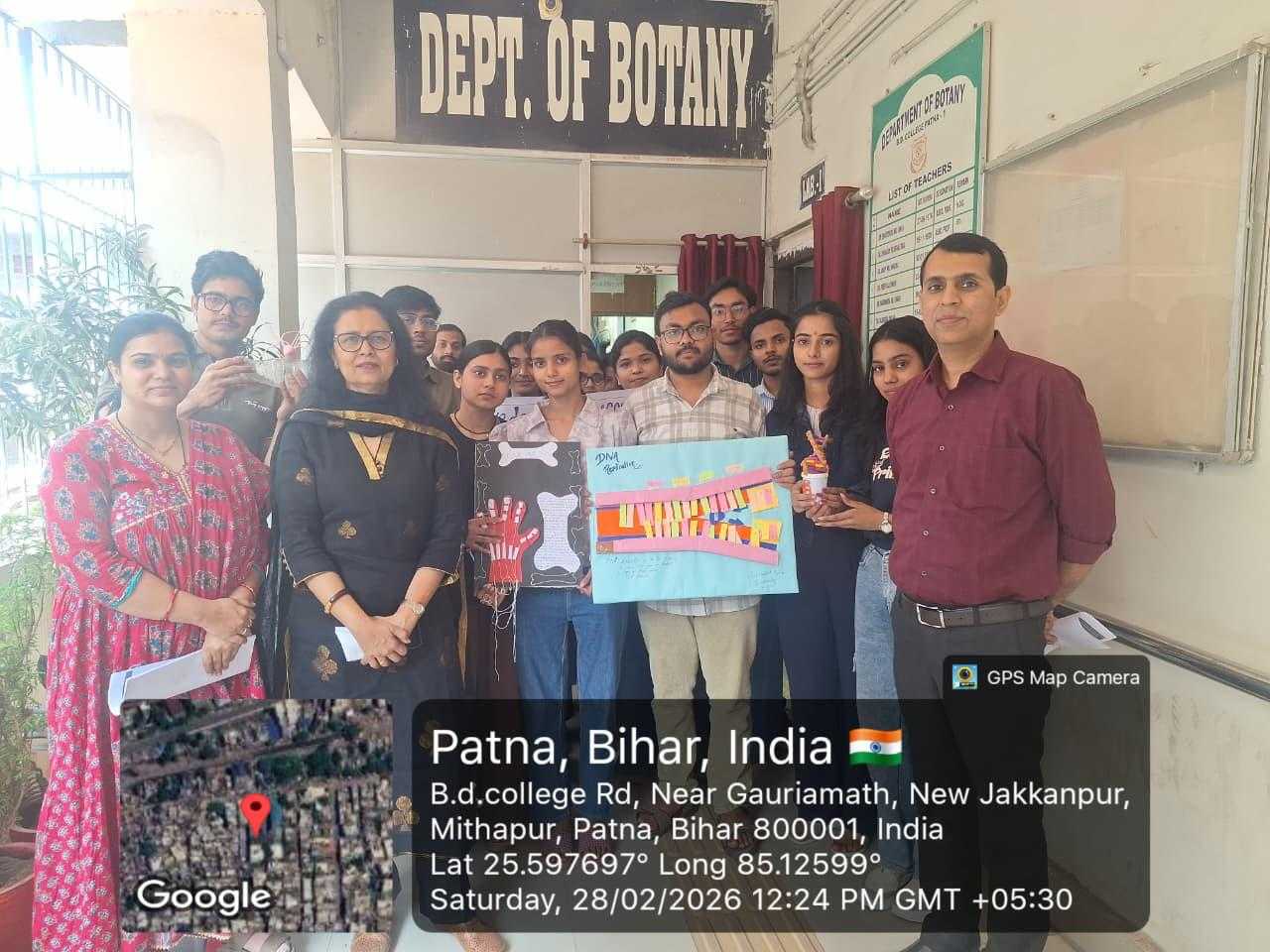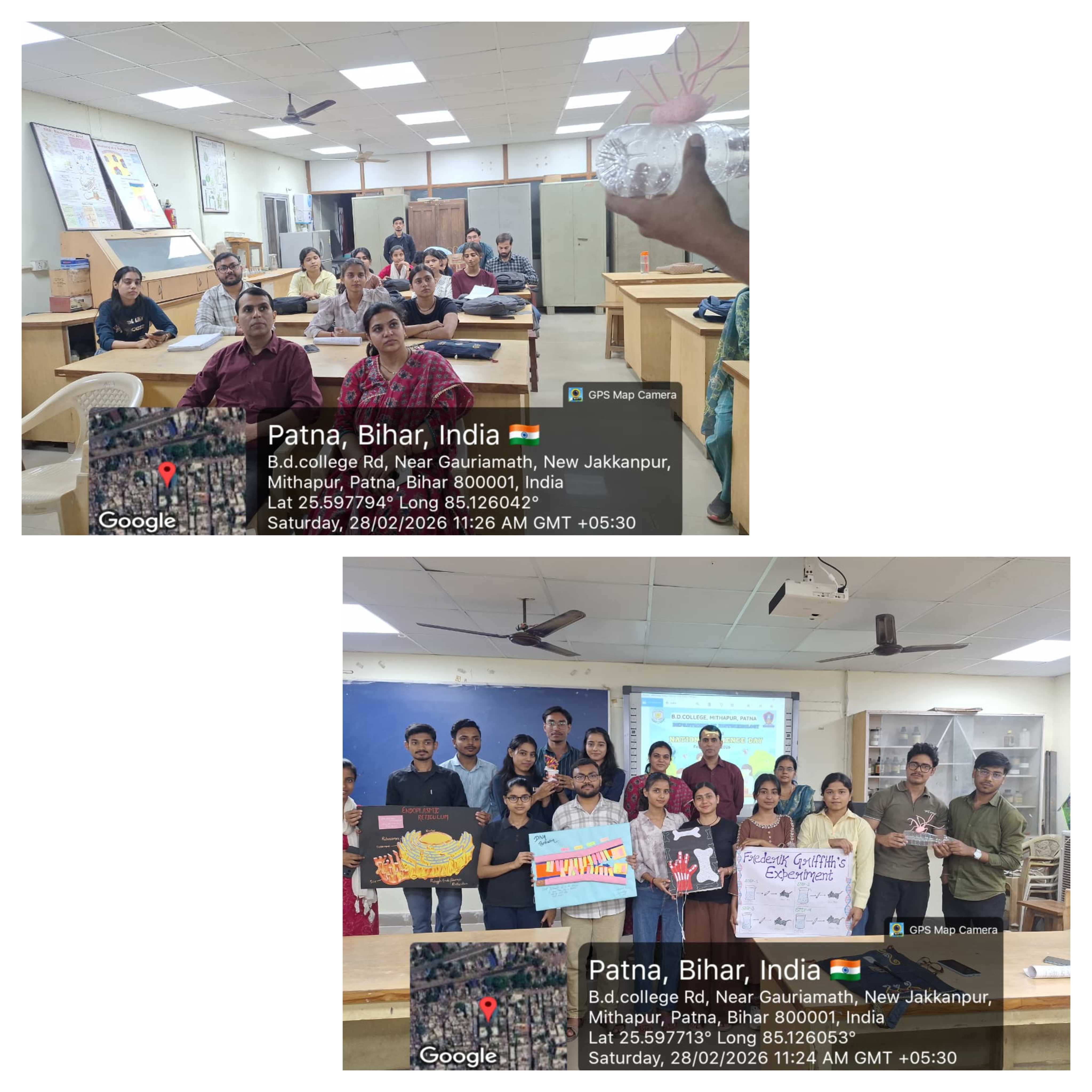 On 28 February, Dept of Biotech, B.D. College, Patna celebrated National Science Day. Principal Prof. Ratna Amrit, IQAC Dr. Diwakar Kumar Pandey & Coordinator Dr. Garima Pathak emphasized innovation. Faculty Dr. Deepak Ratna, Dr. Seema Singh, & Mr. Amit Sibhanshu guided students. Exhibits featured models & charts on DNA double helix, DNA replication, hinge joints, Griffith experiment & endoplasmic reticulum, showcasing practical skills.