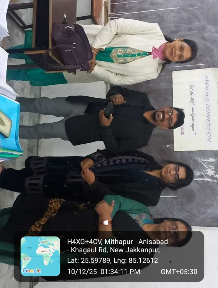 The Department of English organized an open mic event on December 10, 2025, to provide students with a platform to showcase their creativity. Students from different semesters participated enthusiastically and presented a variety of events, including poetry recitation, storytelling, singing, stand-up acts, and short monologues. The winners of the event were Riya Kumari, Sakshi, and Khushi. Dr. Mamta Sharma, Dr. Anna Krishna, and Dr. Suchi Smitha were present at the event.