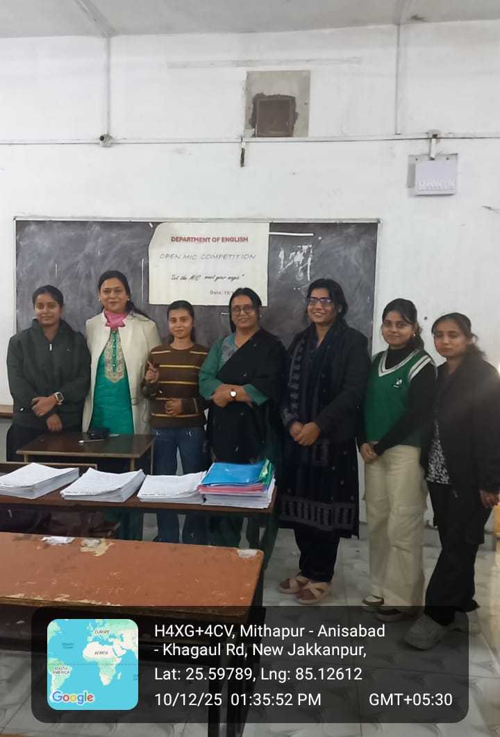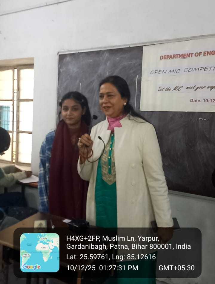 The Department of English organized an open mic event on December 10, 2025, to provide students with a platform to showcase their creativity. Students from different semesters participated enthusiastically and presented a variety of events, including poetry recitation, storytelling, singing, stand-up acts, and short monologues. The winners of the event were Riya Kumari, Sakshi, and Khushi. Dr. Mamta Sharma, Dr. Anna Krishna, and Dr. Suchi Smitha were present at the event.