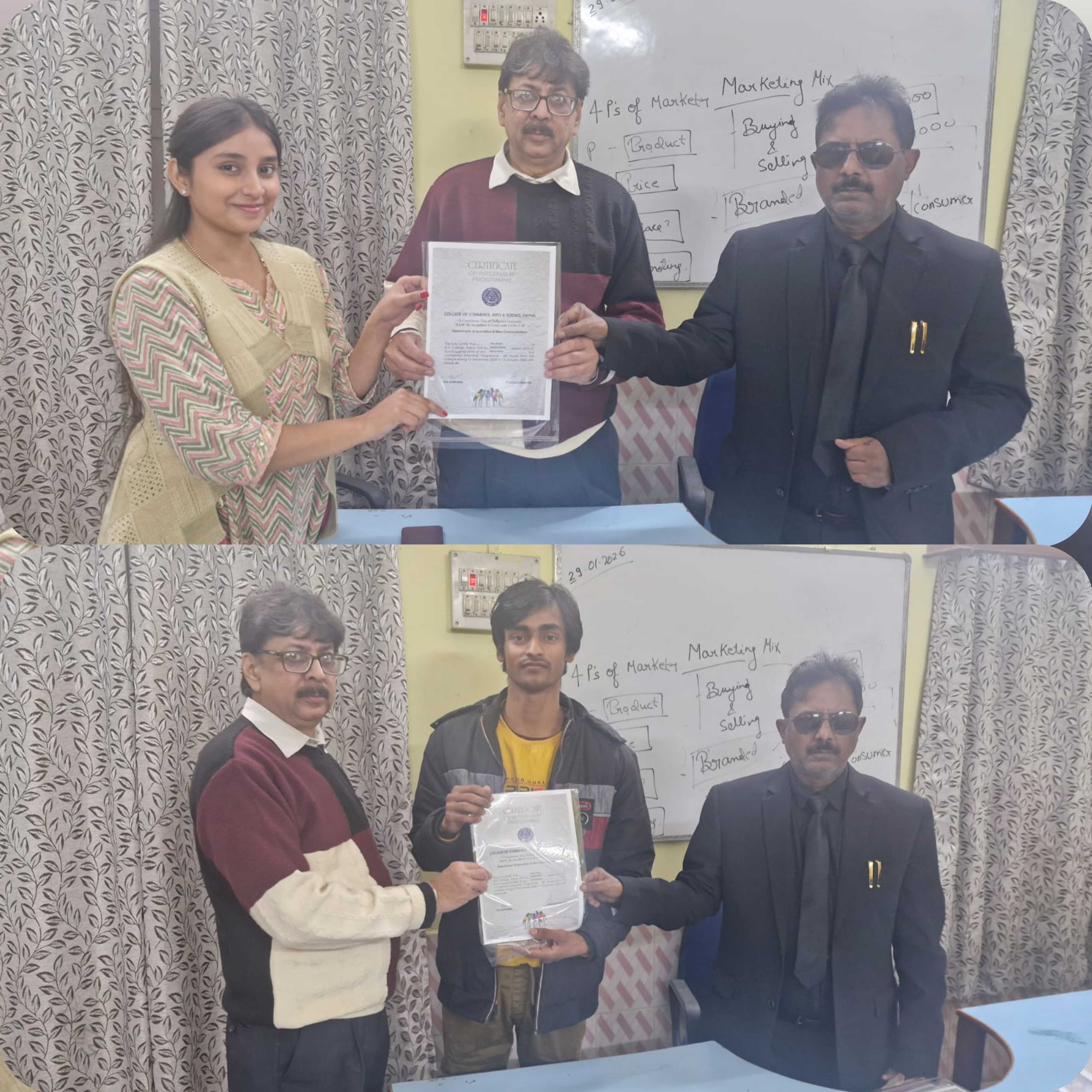 The students of Semester V (English) successfully completed their internship in Mass Communication at the College of Commerce, Patna, gaining valuable practical experience.