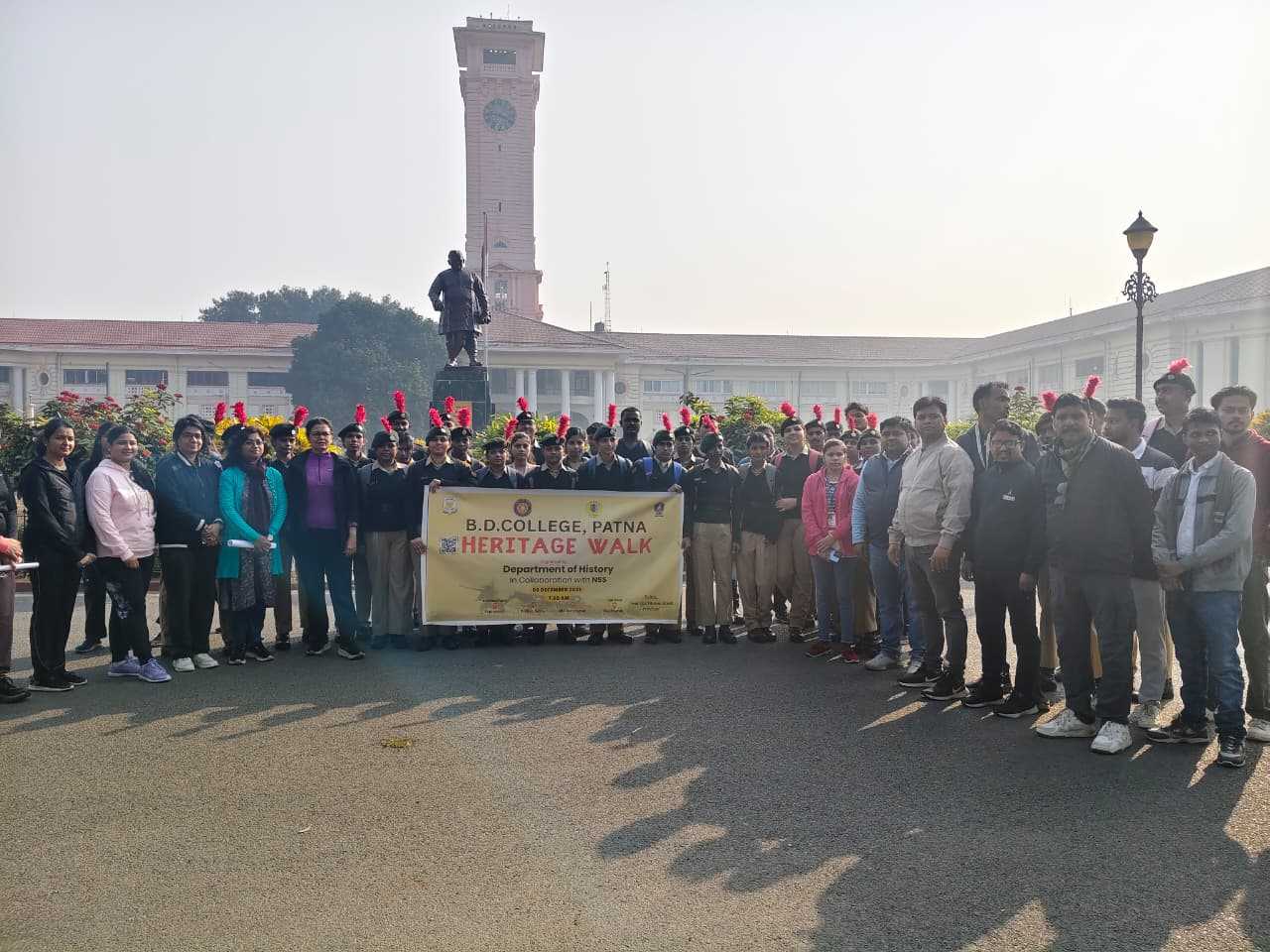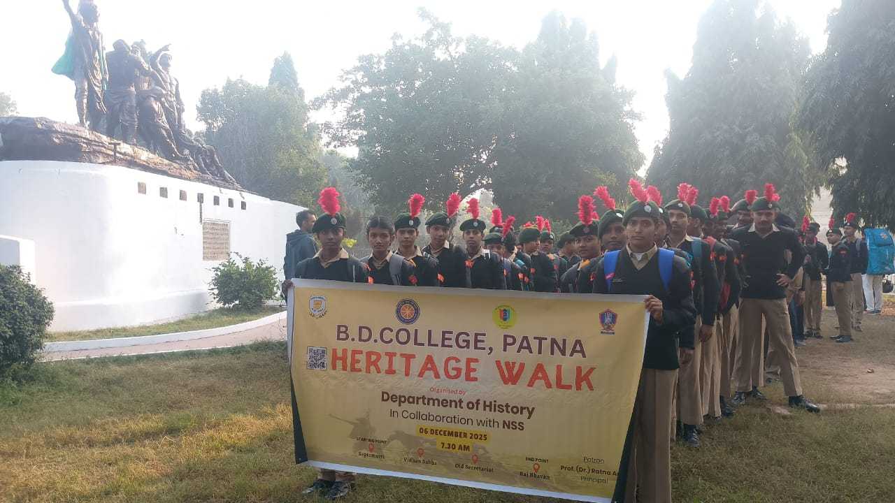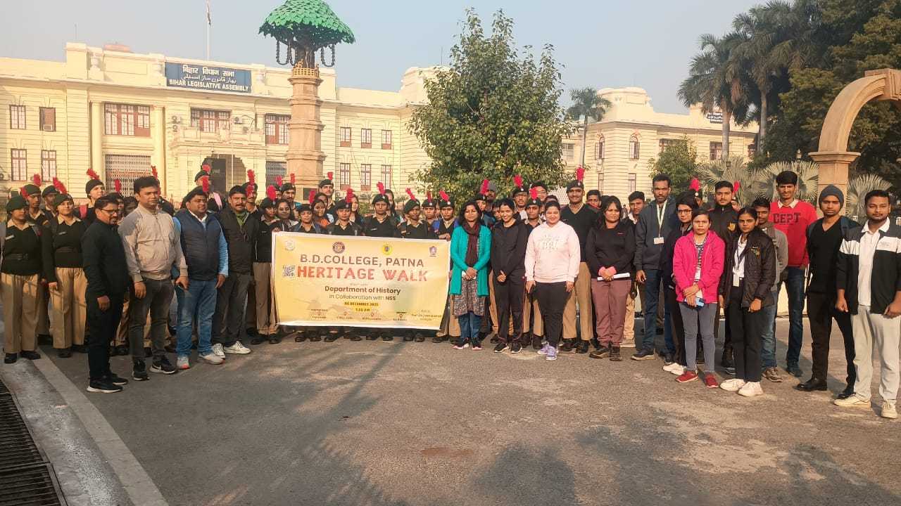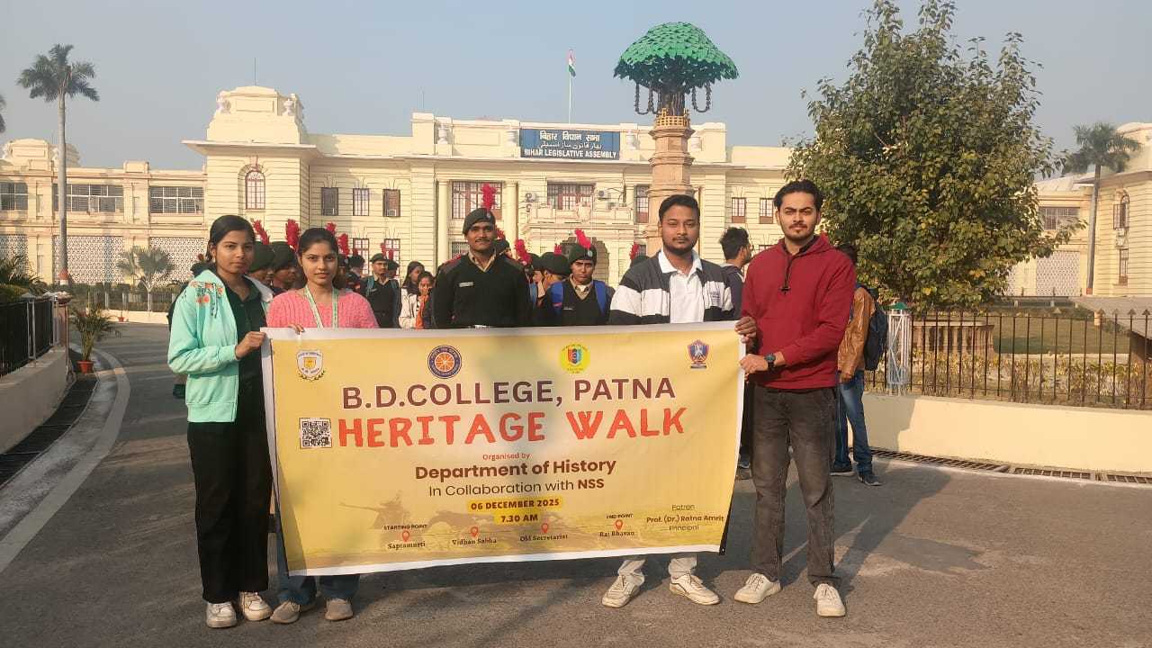 On December 6, 2025, a heritage walk was successfully organized with the joint support of the History Department and the National Service Scheme (NSS) unit of B.D. College, Patna. The program was graced by the presence of the college's Principal, Prof. (Dr.) Ratna Amrit, who served as the event's chief patron. Addressing the students, she shared her views on Patna's administrative and cultural heritage, historical consciousness, cultural sensitivity, and heritage conservation.