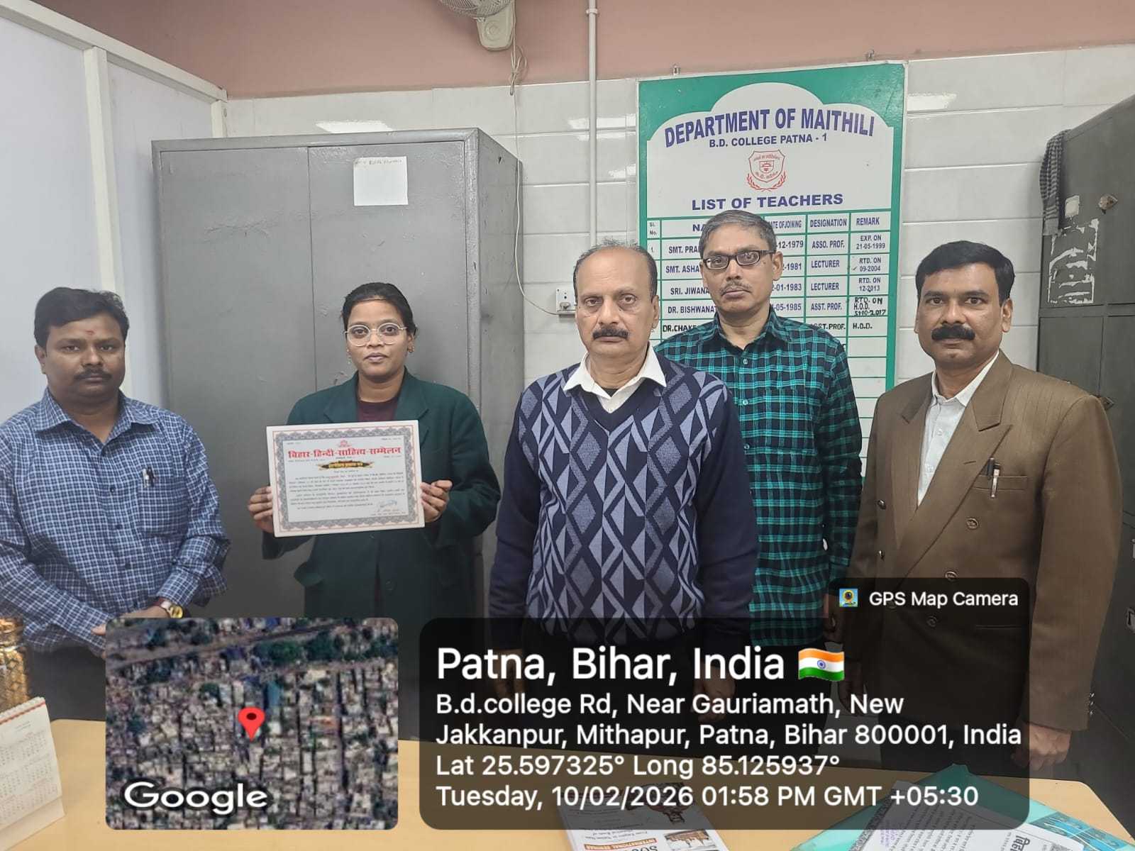 Madhu Kumari, a Maithili Department student, received her internship certificate from the Bihar Hindi Sahitya Sammelan, Patna. Despite completing her work earlier, technical issues delayed the award. Following the presentation, a photo session was held with HOD Saroj Kumar, Dr.Chakradhar Thakur, Dr.H.K. Singh, and Dr.Mahesh Kewat. Faculty praised the internship role in student development and wished her a bright future.