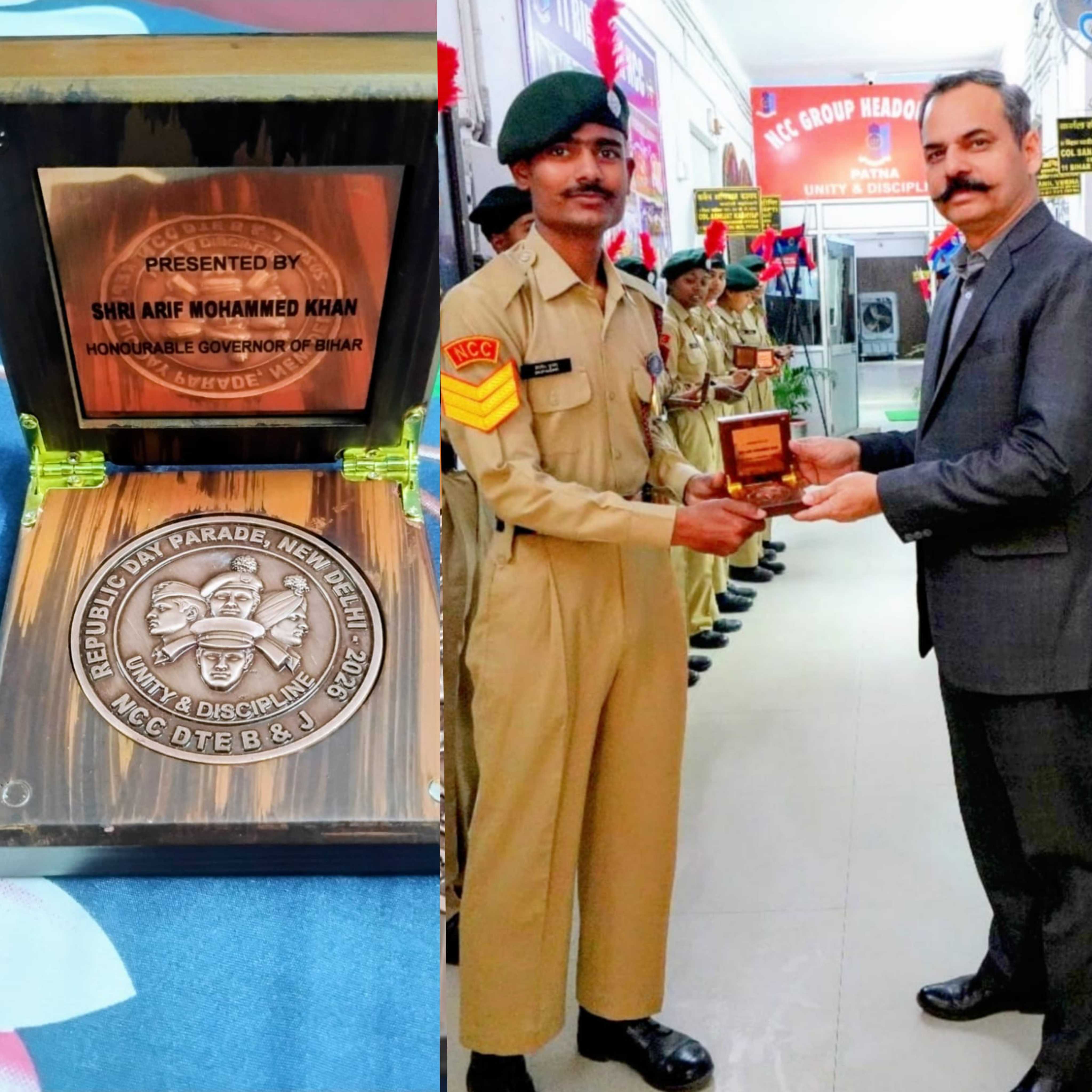 NCC after participation in Republic Day Parade (RDC) 2026, New Delhi. Cadet Dilip Kumar was awarded the Commemorative Medal. This honor was given after participation in the Central Culture Program in front of His Excellency the Governor during a function organized at Lok Bhawan, Patna under AT HOME programme. This Commemorative Medal was presented to Cadet Dilip by Colonel Sanjeet Kumar on behalf of His Excellency the Governor.