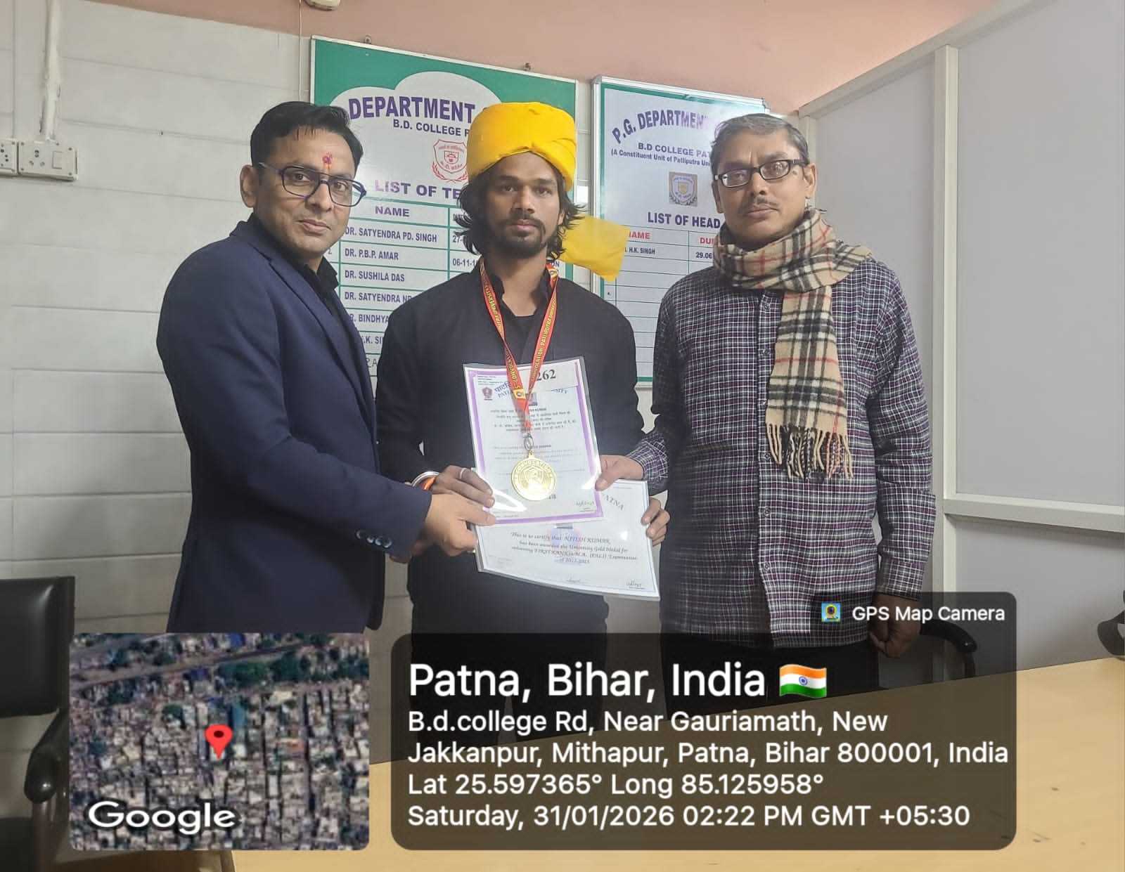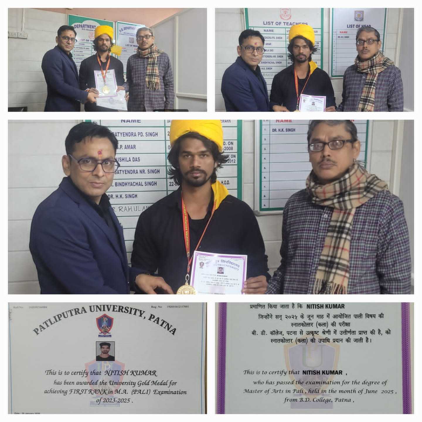 Nitish Kumar of the Pali Department was awarded a gold medal for securing first rank in M.A. Pali (2023–2025) at the 5th convocation of Patliputra University, Patna. At a felicitation in the Pali Dept, HOD Dr. Rahul Amritraj and Prof.Dr.Hanumandeshwar Kumar Singh honored him with a pen. Nitish has also cleared UGC-NET 2025. His achievement has enhanced the department's prestige and filled the college with joy. College rejoiced in his success.