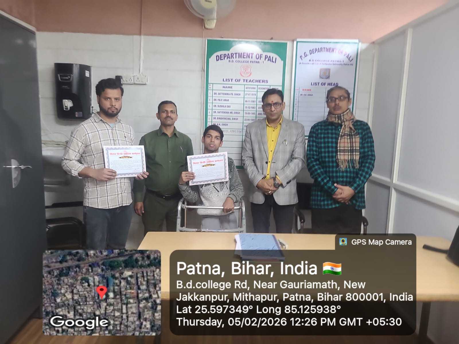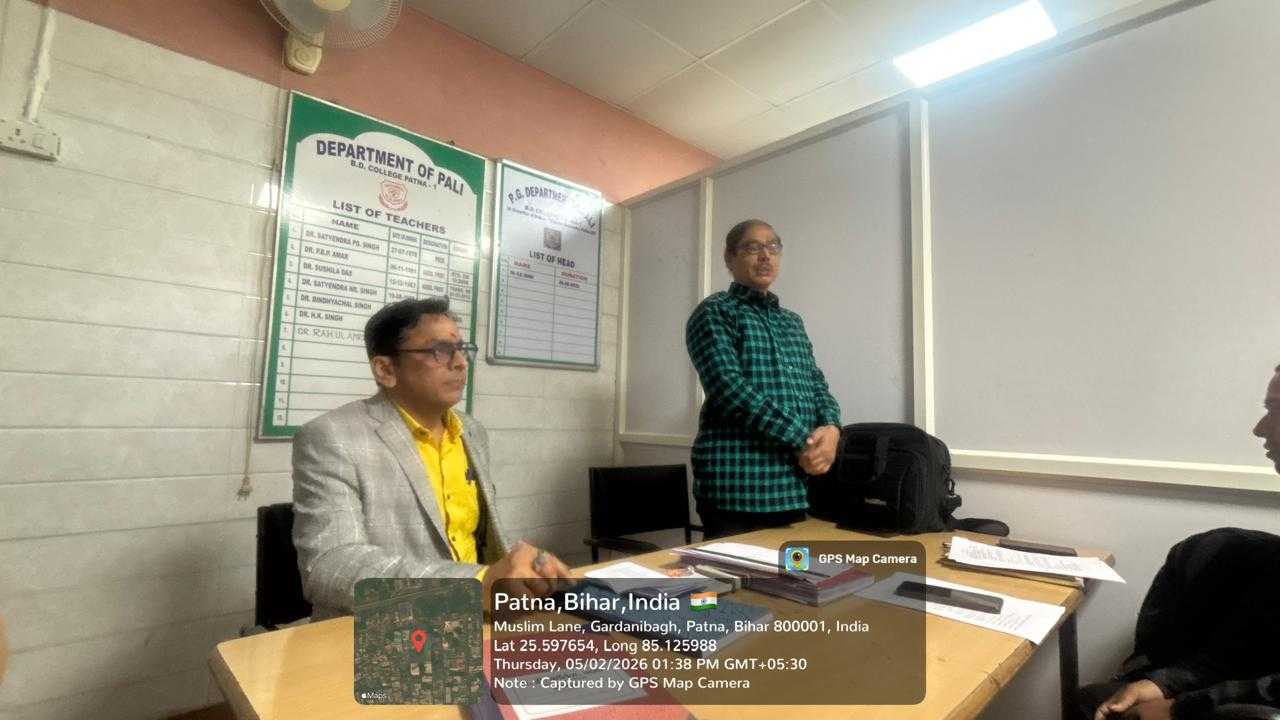 B.D. College, Patna’s Pali Dept held a Pupphavagga recitation today Led by Dr. Rahul Amritraj & Dr. H.K. Singh, it included Dr. Ladli Kumari, Dr. Ravi Kumar, Dr. Vishal Vijay, Dr. Rajiv Kumar, Dr. Ashok Kumar, Dr. Mahesh Kewat, and Dr. Chakradhar Thakur. The event explored Buddhist ethics and karma, fostering spiritual peace. The department thanked all faculty and students for their presence in this academic and spiritual session.