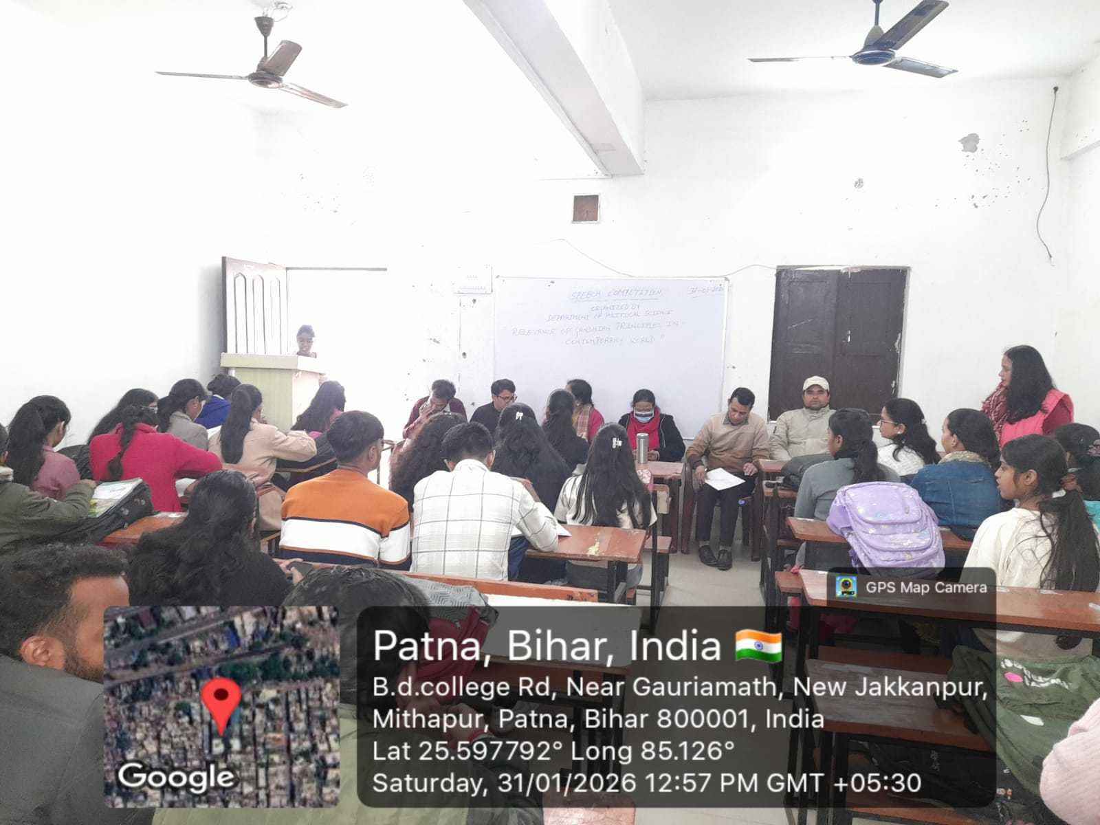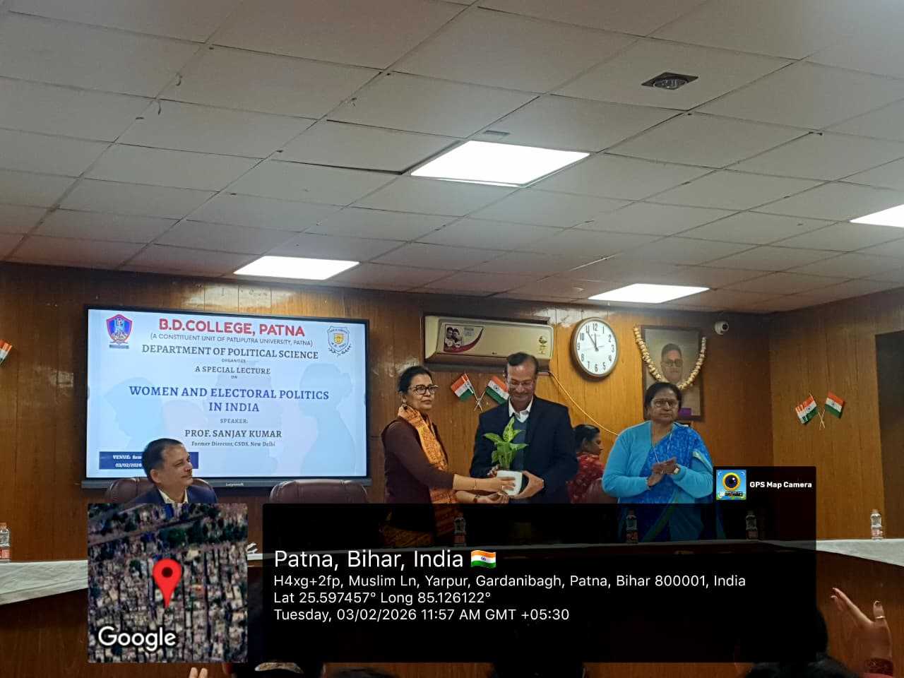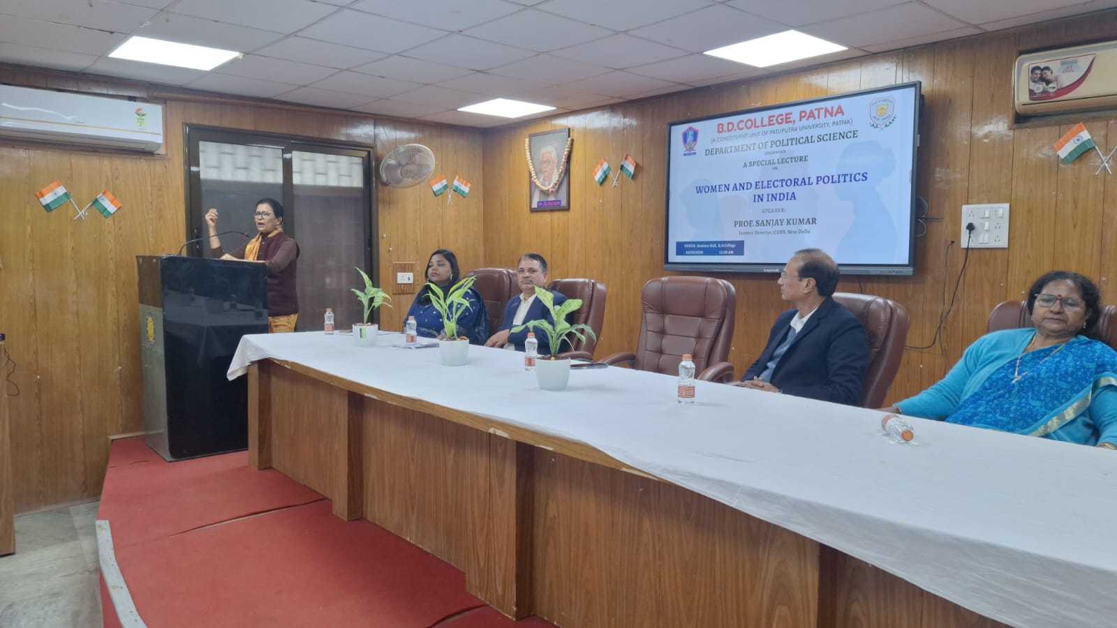 The Dept. of Political Science, BD College, held a lecture on "Women and Electoral Politics in India." Principal Prof. Ratna Amrit emphasized empowerment, while keynote Prof. Sanjay Kumar (CSDS) discussed barriers. Chaired by Dr. Sarita Kumari, the panel featured Prof. Sita Sinha and Dr. Mukesh Kumar Rai. Moderated by Dr. Aparajita, the event saw high engagement and ended with Dr. Vijay Shankar Vikram’s vote of thanks.
