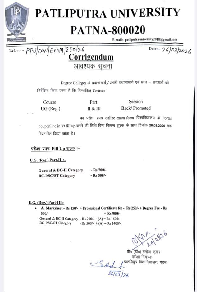 Patliputra University extends online exam form submission for UG (Reg. & General) Part-III Back/Promoted students till 01 April 2026 via ppuonline.in. Fees as per Notice