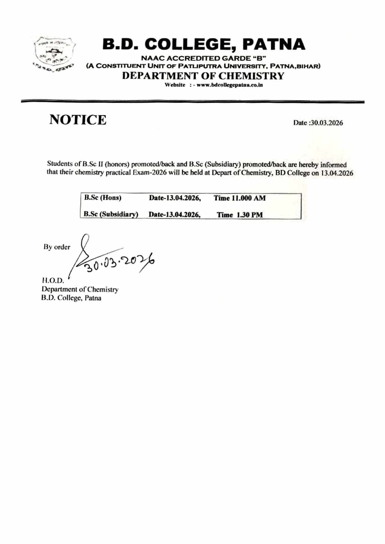 B.D. College, Patna announces Chemistry Practical Exam-2026 for B.Sc II students. Honors exam will be held on 13-04-2026 at 11:00am, and Subsidiary exam on the same day at 1:30p in the Dept. of Chemistry. Students are advised to attend as scheduled.