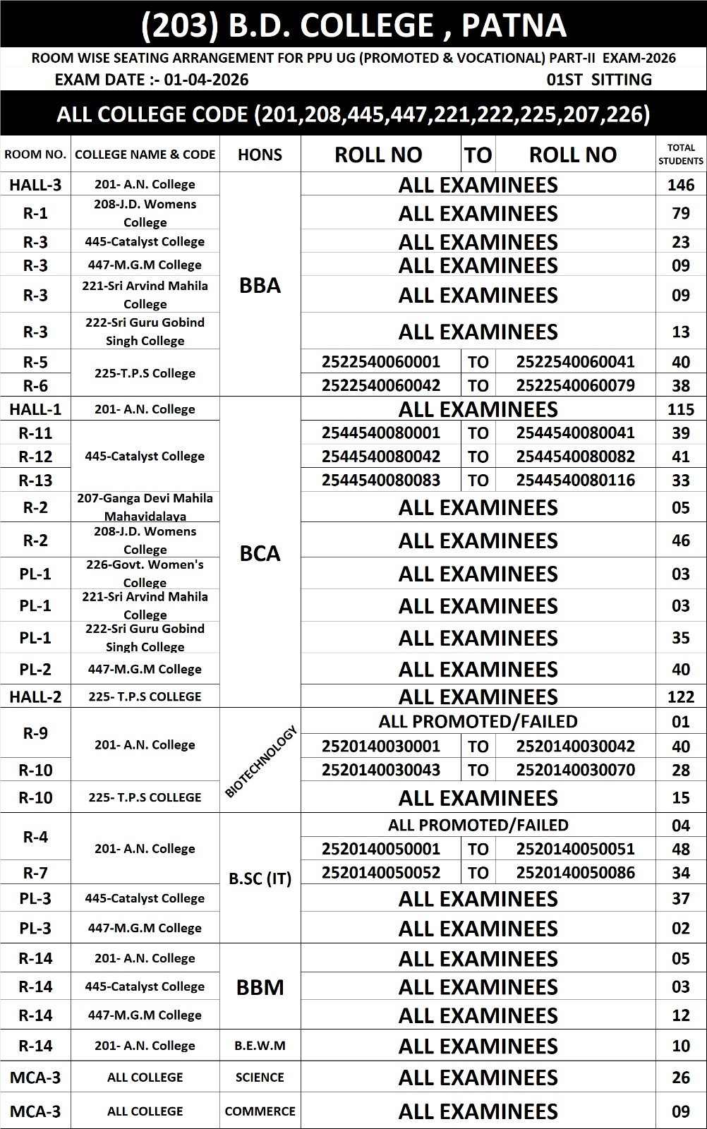 B.D. College, Patna releases room-wise seating chart for PPU UG Part-II (Promoted & Vocational) Exam-2026 scheduled on 01 April 2026, first sitting (10:00 AM–1:00 PM). Includes college codes, room numbers, roll ranges, and total students per room.