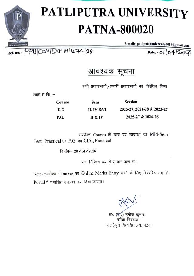 Patliputra University directs completion of Mid-Sem Tests and Practical exams for UG & PG courses by 20 April 2026. Online marks entry will be available on the university portal for all concerned institutions.