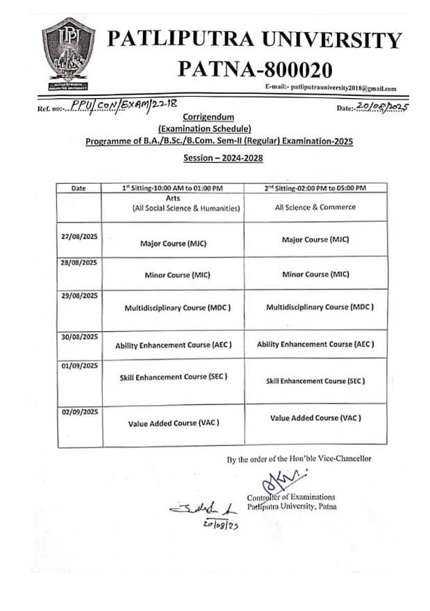 Ref. No: PPU/CON/EXAM/2218 Examination Schedule of Session-2024-2028 B.A./B.Sc./B.Com. Sem-II (Regular) Examination-2025