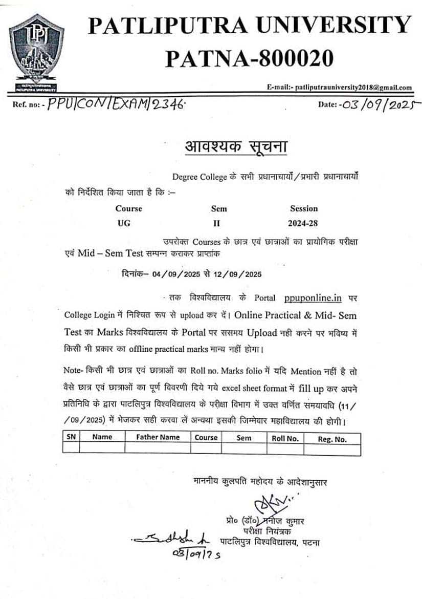 Ref. No: PPU/2346, All Degree Colleges are directed to upload the obtained marks by the students of UG Sem-II 2024-28 after Practical Exam and Mid-Sem Exam on the University Portal.