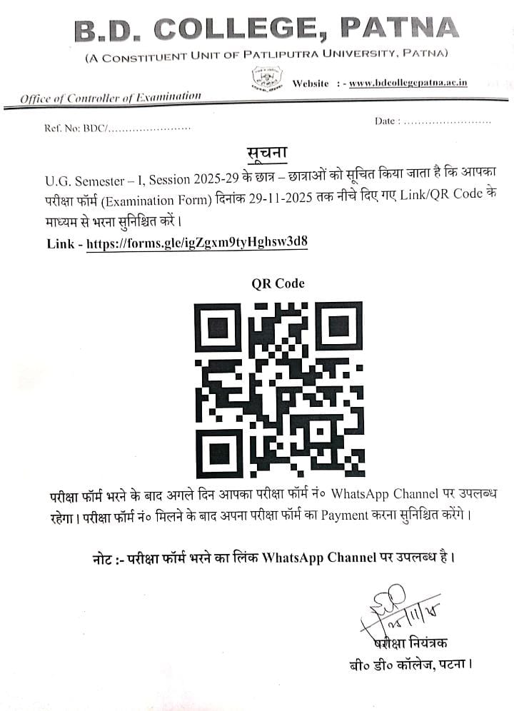 U.G. Semester - 1, Session 2025-29 students are informed to fill their examination form by 29-11-2025 through the given link or QR code. Link - https://forms.gle/igZgxm9tyHghsw3d8
